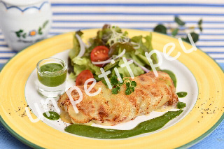 うろこに見立てたじゃが芋で白身魚をぐるりと包み、クリスピーに香ばしく焼き上げます。ハーブの爽やかな緑色のソースを添えていただきます。形を崩さず上手に焼き上げるコツをマスター。