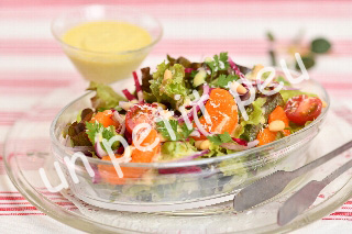 いろどり野菜やフルーツを盛り合わせたサラダに、まろやかなオリーブオイルのクリームソースを添えて。